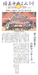 埼玉中央よみうり記事 公開日:2026年3月13日 お知らせ新聞記事 本日3月13日(金)付の埼玉中央よみうりに小針ヤンキーズ創立50周年記念式典の記事が掲載されました。 詳しくは団員のページからどうぞ。 団員のページはヤンキーズHPからお入り下さい。団員のページ閲覧にはユーザー名とパスワードが必要です。詳しくはヤンキーズHP内の「管理人から」のページを参照ください。 この記事を書いている人 kayano1wtc 福岡県出身。カメラ歴35年。 大学4年に当時の MINOLTA α7000 を購入したのが始まり。 α9000、α707siとMINOLTAを使用し続けましたが、デジタルになってからはNIKONを使用。そして今年2021年に古巣のαシリーズに回帰(今はSONY)。 執筆記事一覧 関連記事 雨で順延(県南上尾大会、ノーブルホームカップ)県大会初日写真埼玉新聞記事埼玉新聞記事(県南川口大会ヤンキーズ優勝)MIZUNO DREAM CUP 全国大会 FINAL ラウンド詳細埼玉新聞記事 投稿ナビゲーション 小針ヤンキーズ創立50周年記念史発刊!